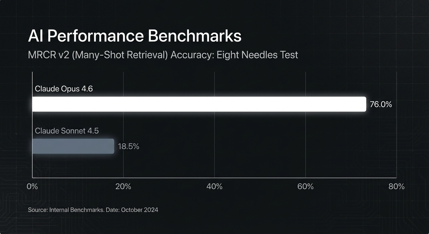 On the MRCR v2 (Many-Shot Retrieval) benchmark, Opus 4.6 hits 76% accuracy on the "eight needles" test. For comparison, Sonnet 4.5 scored 18.5%. That is the difference between a demo and a production-ready legal analysis tool. I’m currently testing ingesting entire repositories rather than relying on RAG chunking, and the "context rot"—where instruction following degrades as context grows—is barely noticeable.